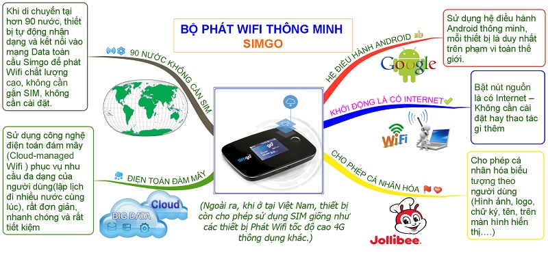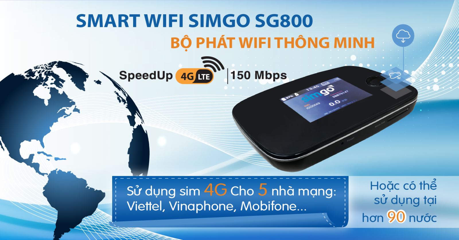 Bộ phát Wifi thông minh Simgo sử dụng tại Việt Nam và hơn 90 quốc gia khác trên toàn thế giới mà không cần gắn SIM. Simgo SG800 đáp ứng nhu cầu sử dụng Internet di động khi đi du lịch hay công tác trong nước và nước ngoài, sử dụng trên xe ô tô gia đình như Mercedes, BMW, Audi, Lexus…