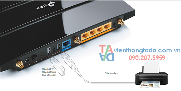 Cổng USB đa năng cho phép kết nối, chia sẻ máy in, tập tin hoặc các thiết bị khác thông qua mạng nội bộ hoặc qua máy chủ FTP.
