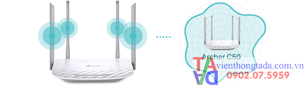 Sử dụng 4 ăng ten giúp phủ sóng rộng. Cùng với đó, Archer C50 sử dụng PA khuếch đại wifi và LNA tăng độ nhạy tiếp nhận để mở rộng hơn vùng phủ sóng wifi