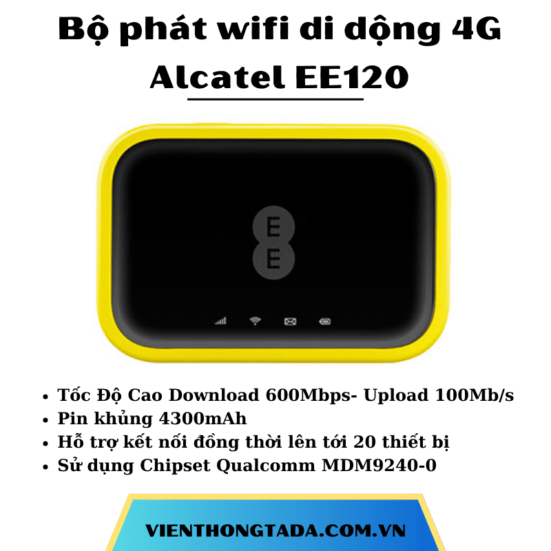 Bộ phát Wifi di động 4G Alcatel EE120 là bổ sung mới nhất vào dòng sản phẩm 4G WiFi nổi tiếng của EE, của công ty viễn thông hàng đầu Alcatel. Nối tiếp thành công của các bộ phát trước Alcatel EE60 và Alcatel EE70, Alcatel EE120 lần này hứa hẹn tốc độ và tính năng tiên tiến, vượt trội hơn so với các đàn anh của nó về hiệu suất và cấu hình. Là thành viên mới nhất của gia đình EE, Alcatel EE120 thể hiện công nghệ tiên tiến, cung cấp cho người dùng kết nối và hiệu suất không giới hạn. Với các thông số kỹ thuật vượt trội và thiết kế đổi mới, Alcatel EE120 đặt ra một tiêu chuẩn mới cho các thiết bị 4G WiFi, phục vụ nhu cầu ngày càng phát triển của người tiêu dùng trong thế giới kỹ thuật số ngày nay với tốc độ nhanh chóng. Sau đây là những đặc điểm nổi trội của sản phẩm này: