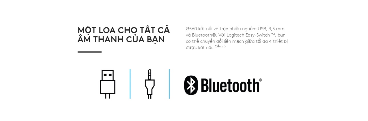 G560 kết nối với nhiều nguồn: USB, 3.5mm và Bluetooth®. Với Logitech Easy-Switch™ bạn có thể chuyển đổi liền mạch giữa tối đa 4 thiết bị được kết nối.