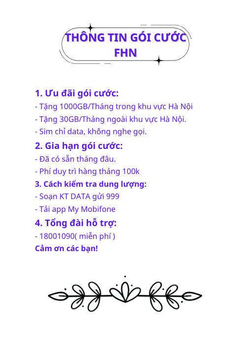 - Tặng 1000GB/tháng trong khu vự Hà Nội, Ngoài Hà Nội có 30GB/tháng.