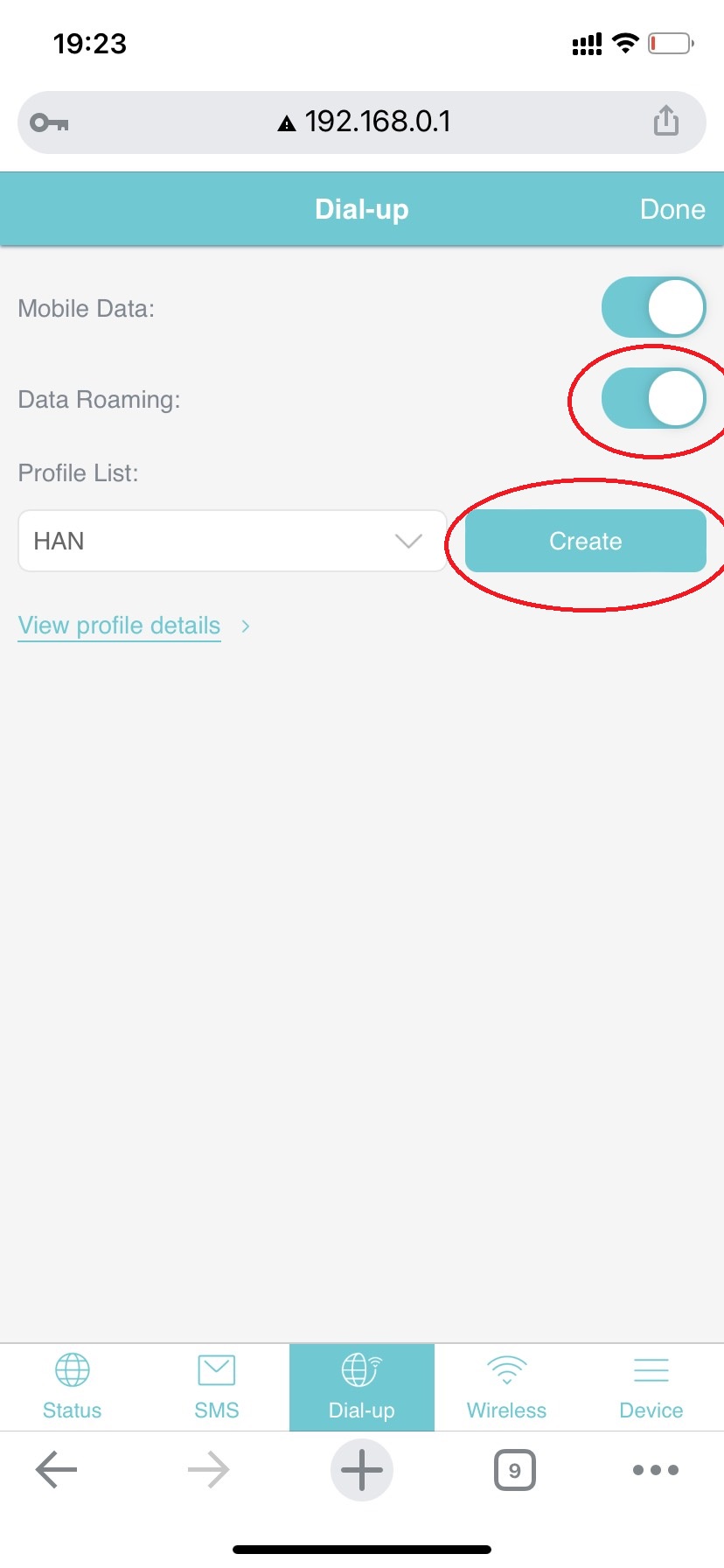 Bước 4: Bật data roaming và ấn vào mục Create để tạo APN