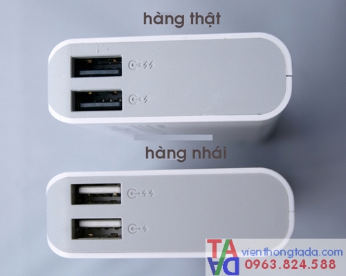- Cổng USB sạc ra: Hàng chính hãng có tia sét dài và sắc nét hơn, đồng thời có cổng USB màu đen. Pin sạc dự phòng nhái có tia sét mờ và cổng USB màu trắng.