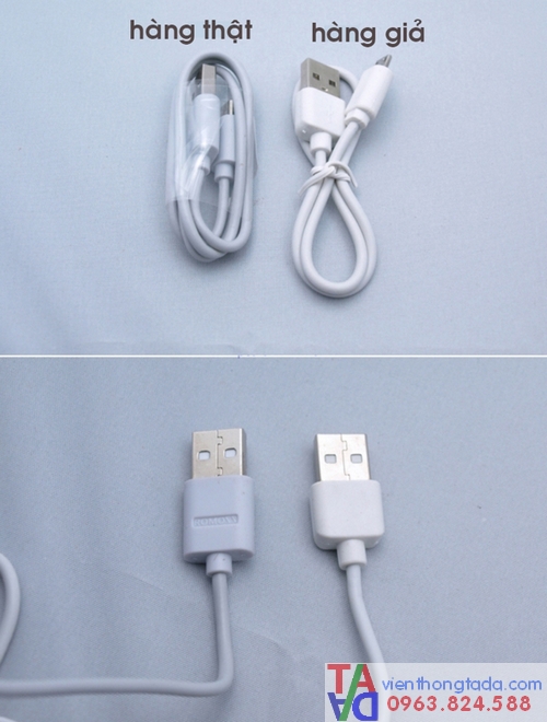 - Cáp USB kèm theo: Cáp sạc chính hãng được dống gói cẩn thận và phần đầu được khắc chìm chữ Romoss. Cáp sạc nhái không có chữ Romoss