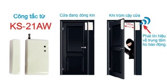 1. Công tắc từ hay còn gọi là cảm biến mỏ cửa được lắp trên cánh cửa, với cự ly hoạt động là 2cm nên chỉ cần vừa mở của là đã kích hoạt về tủ trung tâm báo trộm