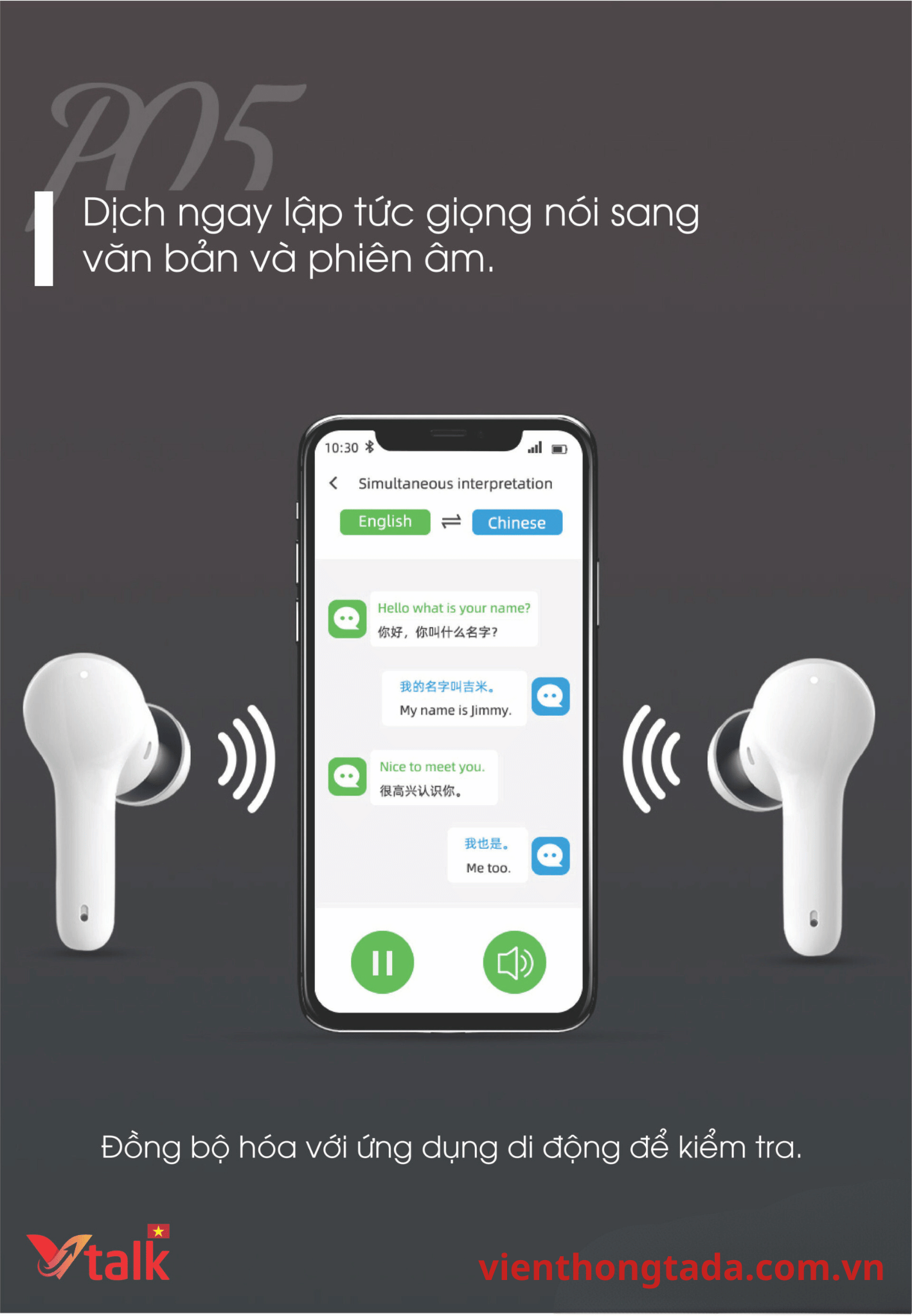 Tai nghe phiên dịch Vtalk Ear là một thiết bị công nghệ cao được thiết kế để hỗ trợ việc dịch ngôn ngữ trong thời gian thực. Được trang bị công nghệ tiên tiến, Vtalk Ear cho phép người dùng nghe và hiểu ngôn ngữ khác ngay lập tức thông qua tai nghe. Tai nghe vận hành bằng cách mỗi người đeo một tai nghe và nói chuyện bình thường với nhau. Máy VTalk Ear sẽ tự thu âm giọng nói của người đeo tai nghe và dịch ra ngôn ngữ của người còn lại. Từ đó, cuộc trò chuyện của bạn sẽ trở nên hết sức tự nhiên.